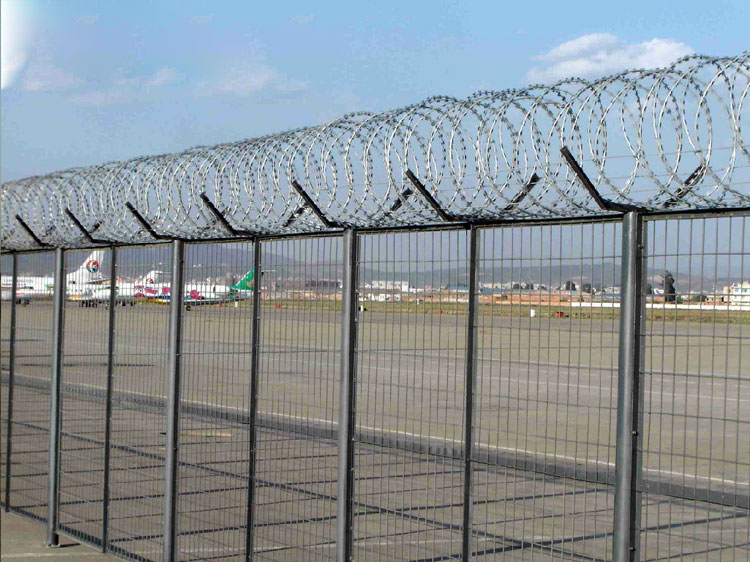 簡述: 機(jī)場圍欄網(wǎng)是安全防盜連接件和熱鍍鋅刀片刺籠組成是強(qiáng)度和安全防御性級(jí)別很高的隔離柵產(chǎn)品。近年來,機(jī)場圍欄網(wǎng)被廣泛應(yīng)用在機(jī)場,軍事基地等高安全場所。(如果在機(jī)場圍欄網(wǎng)頂部加裝刀片刺絲、刀片刺繩后又很好的增強(qiáng)了安全防護(hù)性能。)